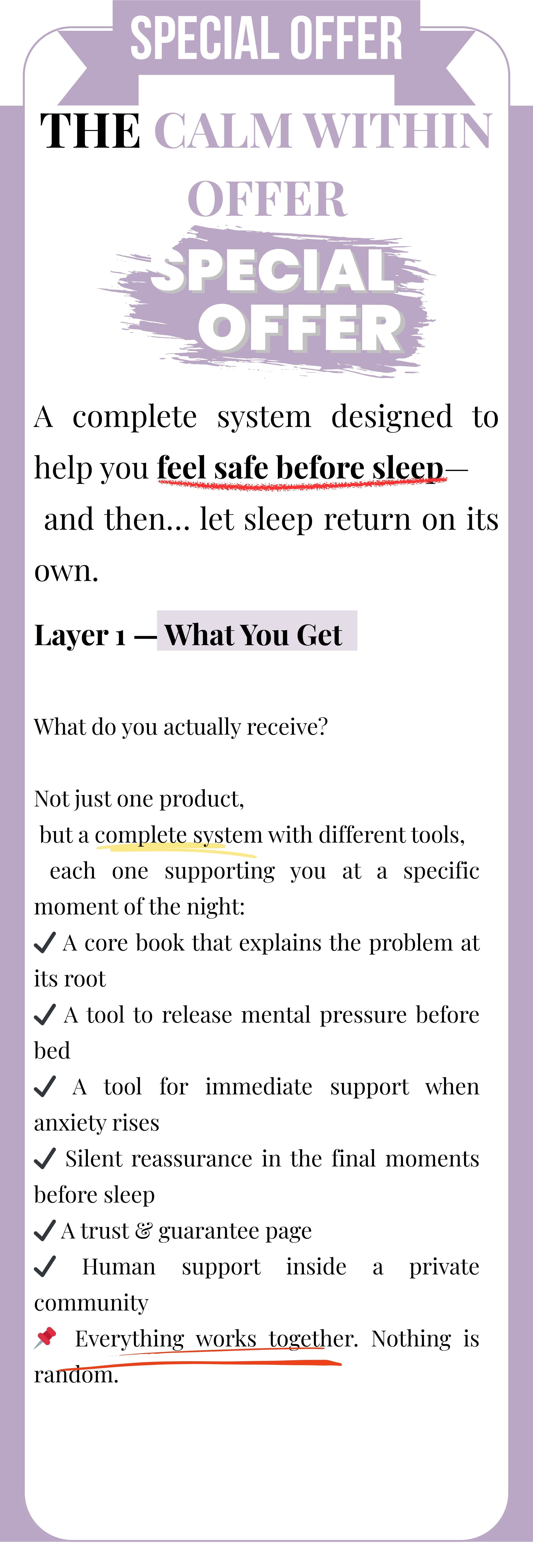 Most solutions try to control sleep.This system removes the fight.Instead of techniques you must “do right,”you get simple support for each moment of the night —before bed, during anxiety, and right before rest.It works with your nervous system, not against it.