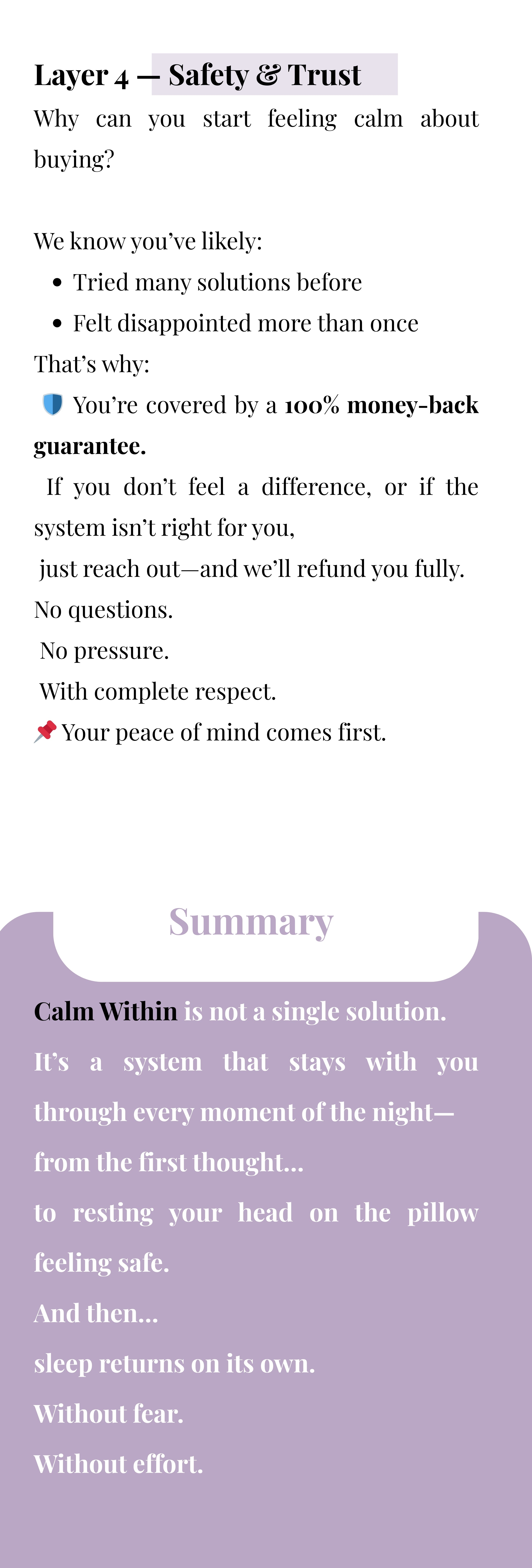 That’s a fair question.This system isn’t built on forcing results or promising instant sleep.It’s built on restoring safety — something your body already understands.If at any point it doesn’t feel right for you,you’re covered by a full money-back guarantee.No pressure. No risk.